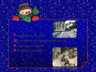 Le document évoque l'innocence des enfants face à l'hiver et la nostalgie des souvenirs passés. À travers un diaporama, une jeune auteure partage ses expériences tout en rendant hommage à la saison hivernale. Elle souhaite à tous de redécouvrir la beauté de l'hiver et sa magie.