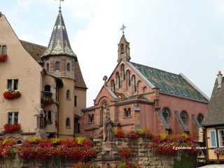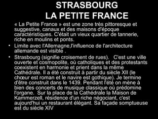 Ce document présente plusieurs villes pittoresques d'Alsace, notamment Strasbourg, Ribeauvillé, Eguisheim, Colmar et Riquewihr, mettant en avant leur riche patrimoine historique et culturel. Chaque ville est décrite par ses caractéristiques architecturales notables, ses événements culturels et son importance historique. Les influences architecturales et les événements marquants tels que des concerts et des foires de vin sont également évoqués.