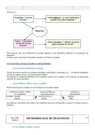 Le document présente une méthodologie de diagnostic des défaillances dans des systèmes mécaniques, électroniques et hydrauliques, soulignant l'importance de la collaboration entre utilisateurs et maintenance pour réduire les probabilités de détection des pannes. Il décrit des outils tels que les schémas fonctionnels, tableaux d'effets-causes et logigrammes pour aider à identifier les causes et remèdes, en insistant sur la nécessité d'un raisonnement logique et d'un diagnostic pertinent. Enfin, il aborde la classification des causes de défaillance pour prioriser les interventions de maintenance.