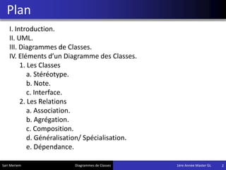 Le document présente les diagrammes de classes en UML, en expliquant leur importance dans la modélisation d'applications avant l'écriture du code. Il définit les éléments clés d'un diagramme, comme les classes et leurs relations (association, agrégation, composition, généralisation/spécialisation et dépendance). Le document détaille également les représentations graphiques des classes et des relations qui constituent un modèle statique d'un système d'information.