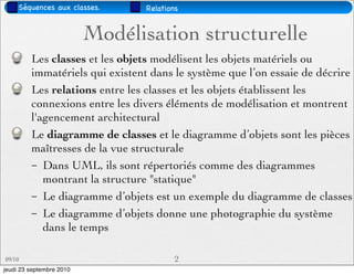 Le document traite de l'analyse et de la conception de systèmes utilisant UML, en mettant l'accent sur les diagrammes de classes et d'objets qui représentent les classes et leurs relations structurelles. Il explique la nature des classes, les opérations et attributs, les différents types de relations (association, agrégation, dépendance) ainsi que les concepts de multiplicité et de généralisation. Enfin, il fournit des conseils pratiques pour la modélisation et l'utilisation efficace des diagrammes UML dans le processus de développement.