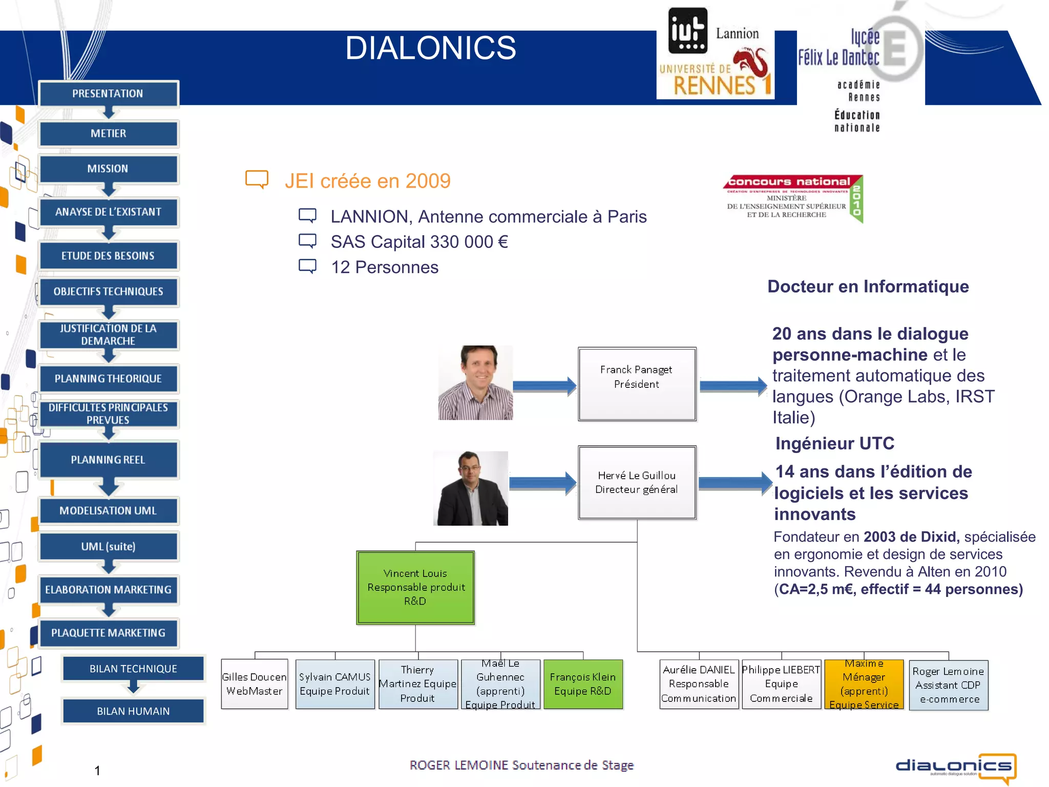Dialonics, fondée en 2009 à Lannion, se spécialise dans le développement d'assistants e-commerce et propose une gamme d'e-assistants pour divers secteurs. Leur objectif est de simplifier les réponses aux questions des clients en pré-remplissant certaines réponses, tout en intégrant les besoins spécifiques des clients dans une offre standardisée. Le projet a permis d'améliorer la gestion de projet et a renforcé la confiance et la motivation au sein de l'équipe.