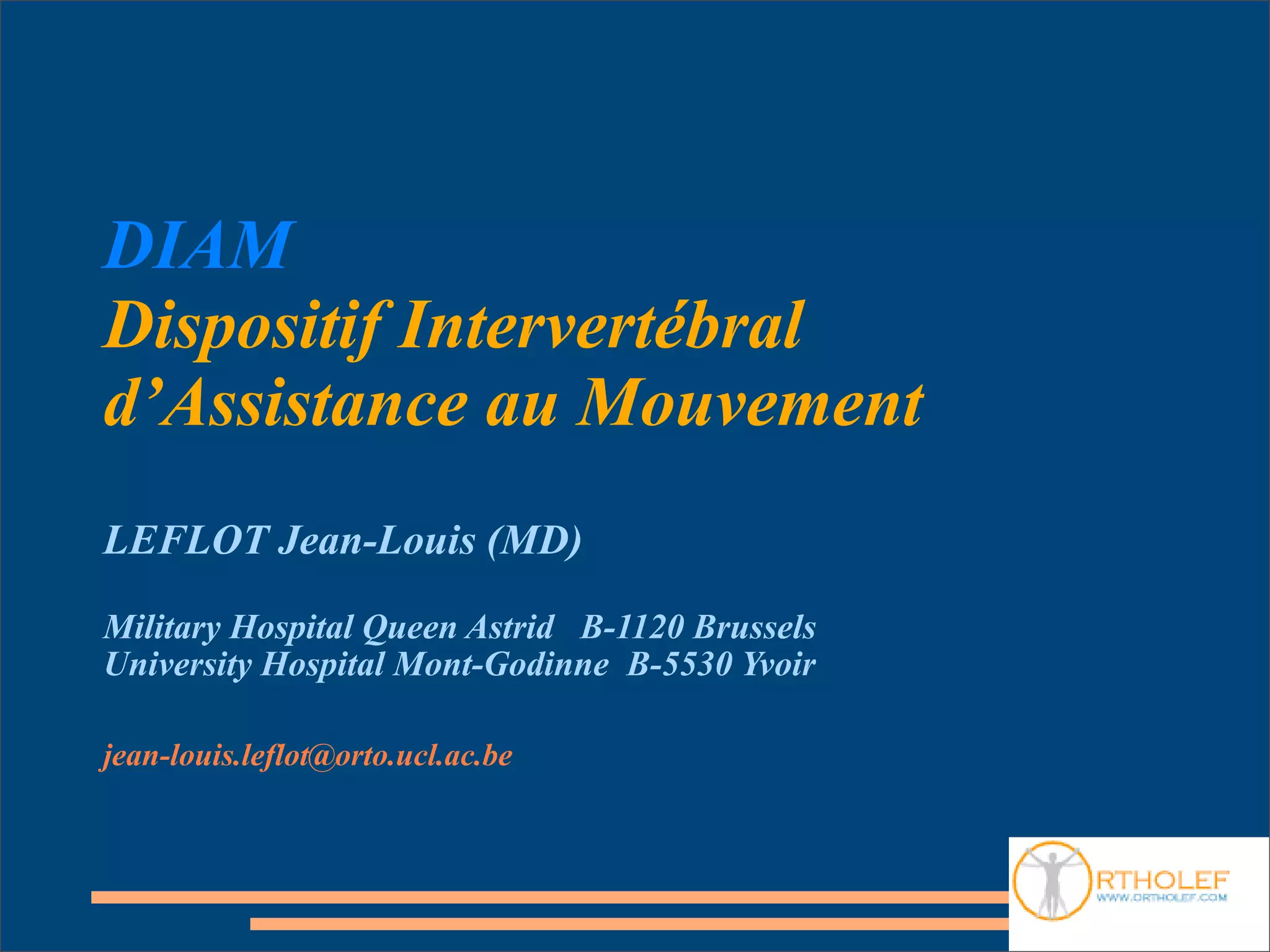 Le document décrit un dispositif intervertébral d’assistance au mouvement, centré sur une approche chirurgicale minimalement invasive pour la stabilisation dynamique de la colonne vertébrale. Il aborde les techniques de positionnement, de préparation et de mise en place tout en respectant les structures anatomiques et en évitant les coupures des ponts ligamentaires. Ce dispositif est indiqué pour des pathologies comme la discopathie modérée et les hernies médianes.