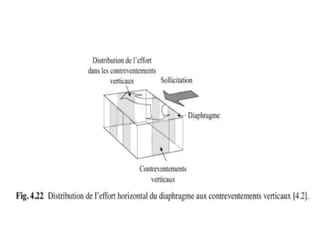 Le document présente les rôles et l'importance des diaphragmes dans la stabilité des constructions face aux charges latérales comme le vent et les séismes. Il définit les diaphragmes comme des structures horizontales qui transmettent les efforts horizontaux aux éléments verticaux de contreventement, assurant ainsi la rigidité et la stabilité des bâtiments. Les différents facteurs influençant la rigidité des diaphragmes et les exigences pour leur conception sont également abordés.