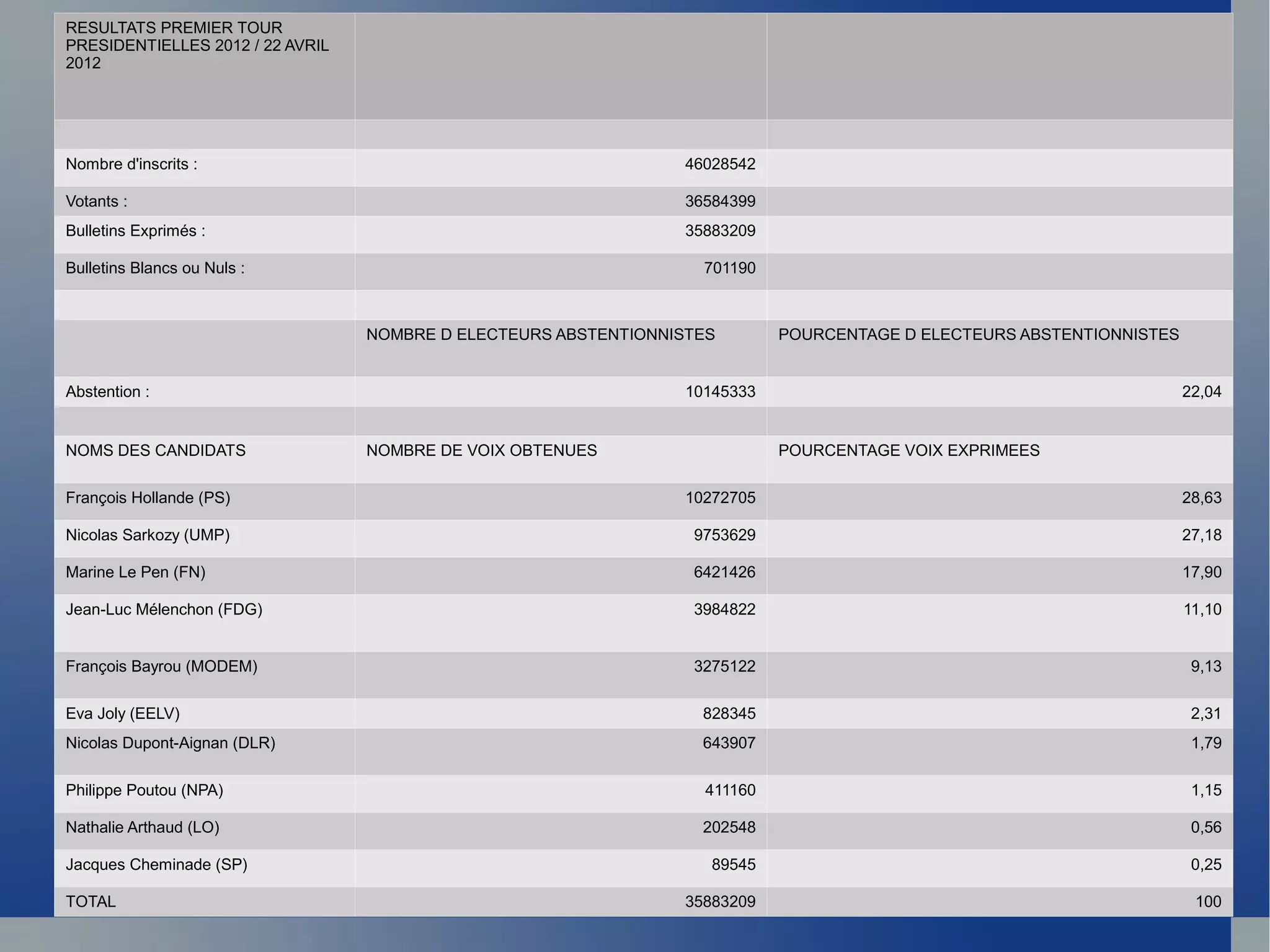 Le premier tour des élections présidentielles de 2012 a enregistré 36 584 399 votants sur 46 028 542 inscrits, avec un taux d'abstention de 22,04%. François Hollande a obtenu le plus de voix avec 28,63%, suivi de Nicolas Sarkozy à 27,18% et Marine Le Pen à 17,90%. Une erreur a été notée dans un tableau concernant le nombre et le pourcentage des abstentions.