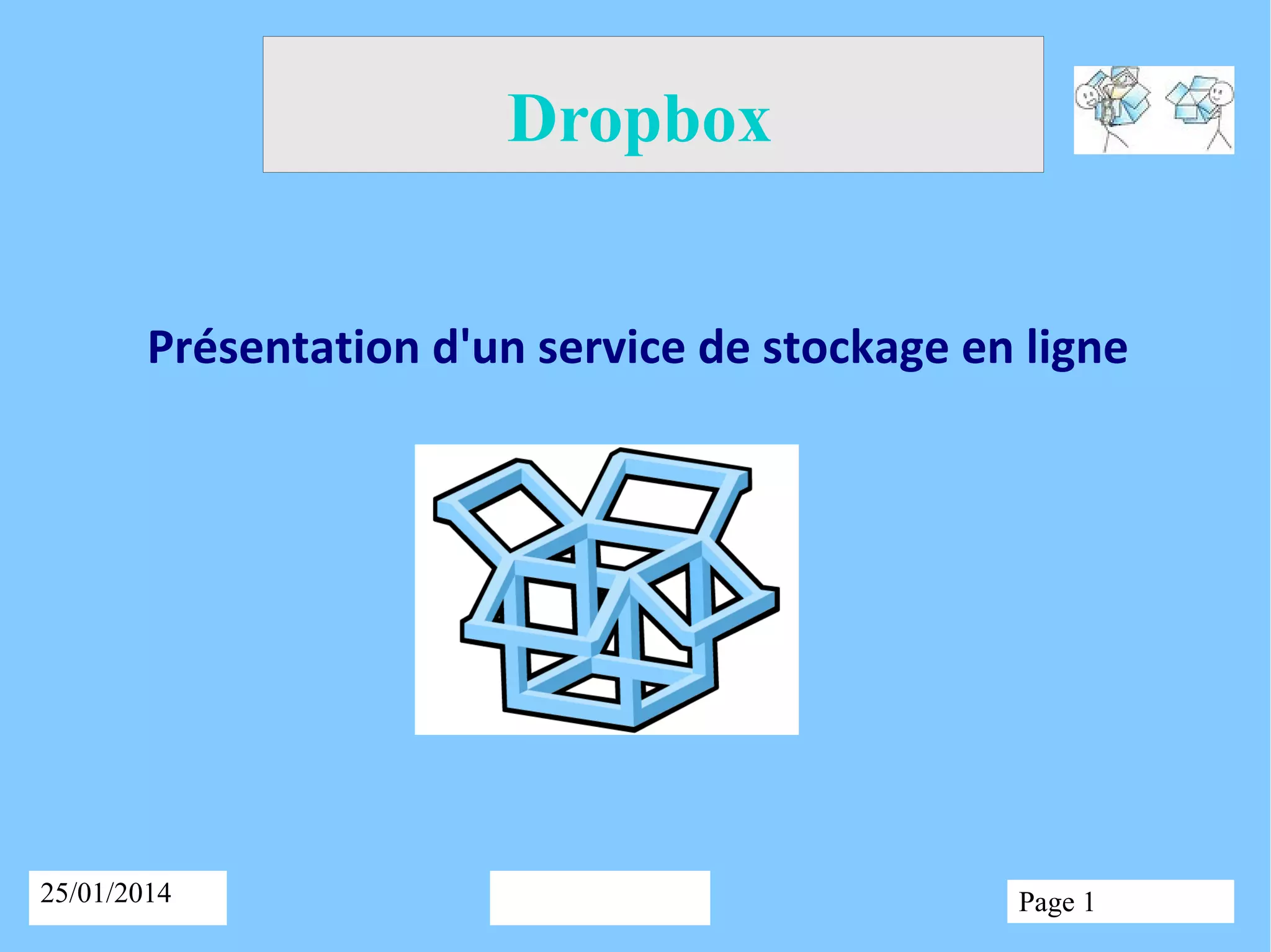 La présentation sur Dropbox présente un service de stockage en ligne permettant de stocker et partager des fichiers facilement. Parmi ses avantages, on note sa simplicité et sa rapidité, ainsi que le fait qu'il remplace les clés USB, bien qu'il comporte des inconvénients tels que la faible capacité de stockage gratuite et des problèmes de confidentialité. Des avertissements sont émis sur les risques liés au dépôt de fichiers piratés, soulignant la responsabilité de l'utilisateur.