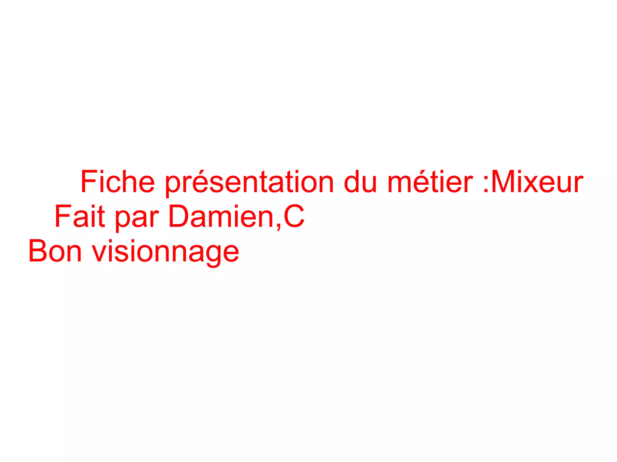 Le mixeur est un professionnel du secteur audio, responsable de l'assemblage de voix, de musique et d'ambiances pour créer une atmosphère sonore dans les films. Exigeant un niveau d'études de bac +2 et des compétences en mathématiques, physique et technique du son, ce métier requiert également une expérience importante. Les conditions de travail se déroulent souvent dans des studios ou auditoriums, où le mixeur travaille principalement dans l'obscurité et sur des horaires peu flexibles.