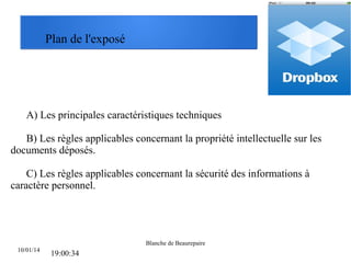 Dropbox est un service de stockage performant qui assure le cryptage des données via AES-256, mais ne garantit pas la confidentialité totale, car ses employés peuvent accéder aux informations. Le document traite des caractéristiques techniques du service, des règles de propriété intellectuelle, et de la sécurité des informations personnelles. Il met en lumière les enjeux de la sécurité et de la confidentialité liés à l'utilisation de Dropbox.