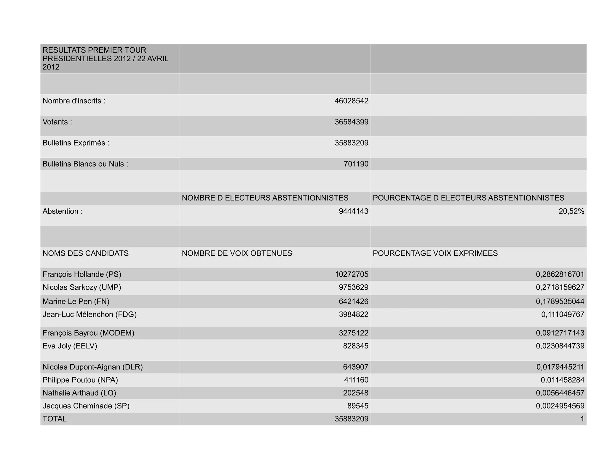 Le résultat du premier tour des élections présidentielles de 2012 en France montre que sur 46 028 542 inscrits, 36 584 399 ont voté, dont 35 883 209 ont exprimé des bulletins valables. François Hollande a obtenu 28,63% des voix, suivi de Nicolas Sarkozy à 27,18% et Marine Le Pen à 17,90%. Une erreur a été relevée concernant le nombre d'abstentionnistes, qui est de 9 441 143 selon le tableur.