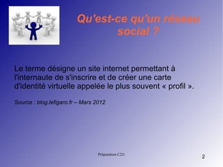 Les réseaux sociaux sont des sites permettant aux utilisateurs de créer un profil et d'échanger des messages et des contenus avec d'autres membres. Des exemples incluent Facebook, LinkedIn, et Google+, avec des millions d'utilisateurs dans le monde. Les données montrent une évolution significative du nombre d'utilisateurs, particulièrement pour Facebook depuis sa création en 2004.