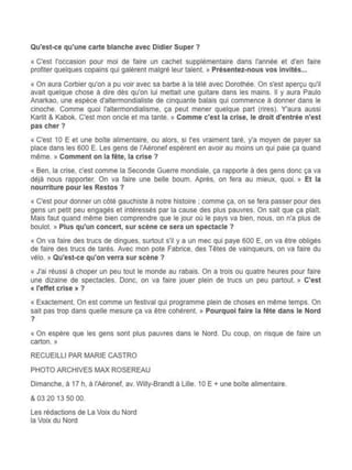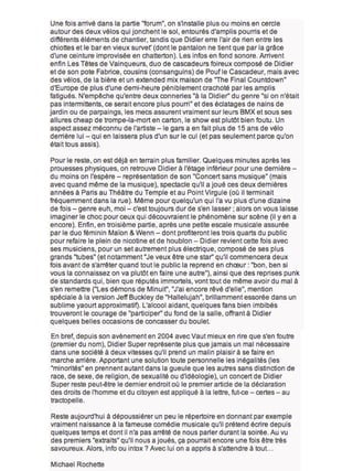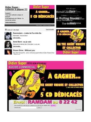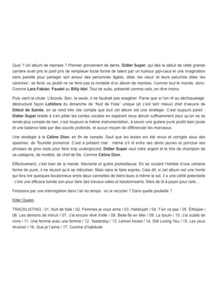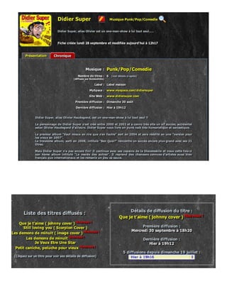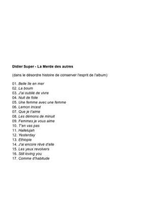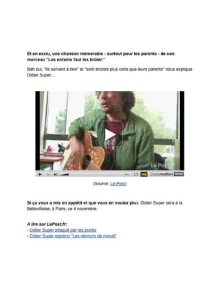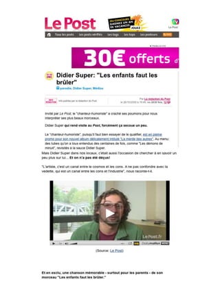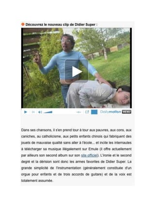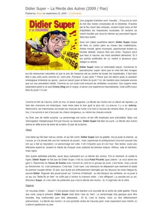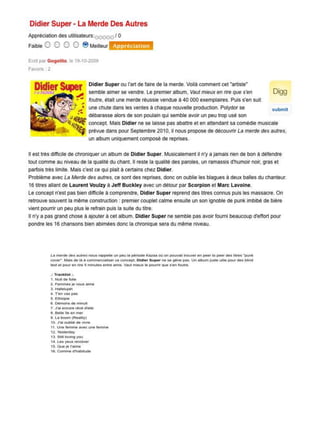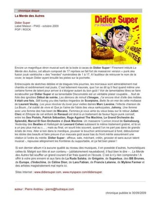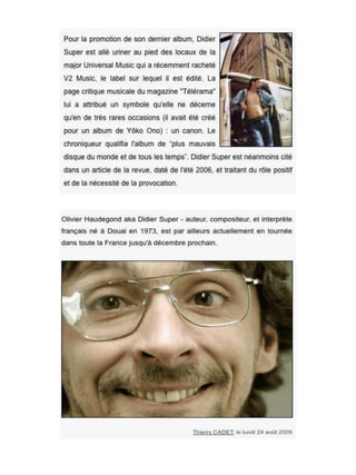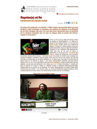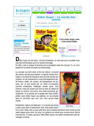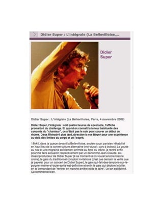 Ce dossier de presse concerne Didier Super, présentant divers liens et remarques sur ses concerts, chroniques d'album et interviews dans la presse. Il met en avant sa dernière sortie d'album 'La Merde des Autres' ainsi que des annonces de spectacles et des critiques. Le document fournit également des informations sur des shows, des émissions télévisées et des articles associés à l'artiste, reflétant son actualité musicale entre 2009 et début 2010.