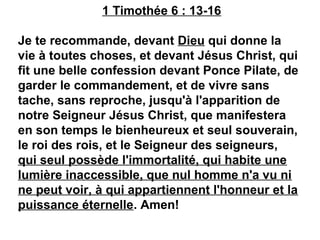 Le document explore la nature de Dieu, en se fondant sur les Écritures, en présentant ses attributs essentiels tels que sa souveraineté, sa sainteté, son amour, et son caractère immuable. Il est souligné que Dieu se révèle à l'humanité à travers des noms comme Yahvé et Elohim, illustrant sa relation avec les êtres humains ainsi que son œuvre créatrice et redemptrice. L'étude conclut que Dieu est une personne vivante qui désire établir une relation avec chaque homme, tout en étant au-dessus de la compréhension humaine.