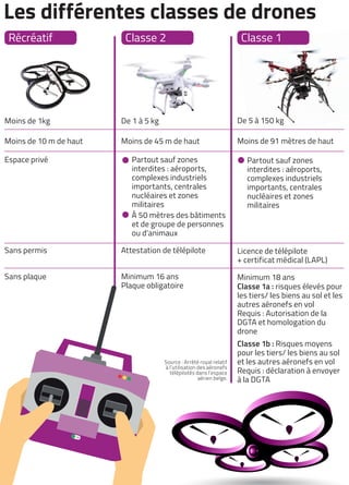 Le document décrit les différentes classes de drones en Belgique, classées selon leur hauteur et leur poids, ainsi que les risques associés et les exigences réglementaires pour chaque classe. Les classes 1a et 1b nécessitent des autorisations spécifiques de la DGTA, tandis que d'autres classes sont soumises à des déclarations ou peuvent être exploitées sans permis dans certaines zones. Les restrictions d'espace et de distance par rapport aux bâtiments et aux groupes de personnes sont également précisées.