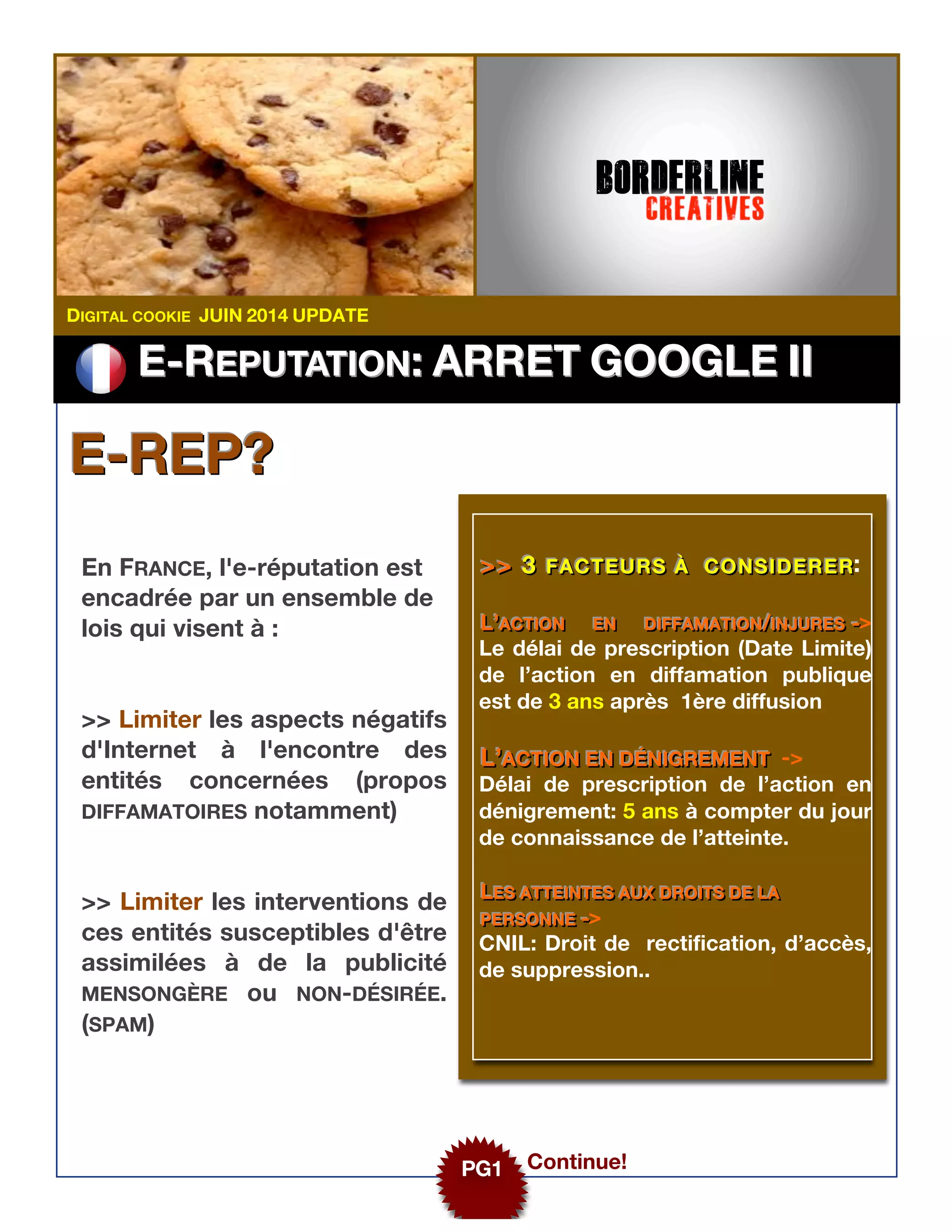 Le document aborde les lois régissant l'e-réputation en France, notamment les délais de prescription pour les actions en diffamation (3 ans) et en dénigrement (5 ans). Il souligne les obligations des responsables de traitement des données personnelles, telles que la sécurité et la transparence envers les personnes concernées. Le droit à l'oubli est également mentionné, précisant que les individus peuvent demander la suppression d'informations pouvant nuire à leur réputation en ligne.