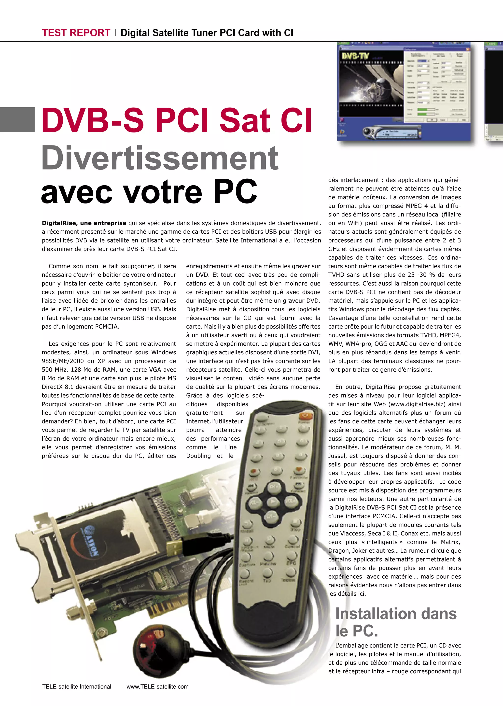Le rapport teste une carte tuner satellite PCI, permettant la diffusion et l'enregistrement de chaînes TV sur un PC, avec des fonctionnalités avancées pour des utilisateurs expérimentés. Bien que l'installation soit simple, le balayage des chaînes peut prendre beaucoup de temps, et certaines fonctionnalités nécessitent une patience supplémentaire. Digitalrise propose également des mises à jour logicielles et un forum pour les utilisateurs pour échanger des conseils et des expériences.