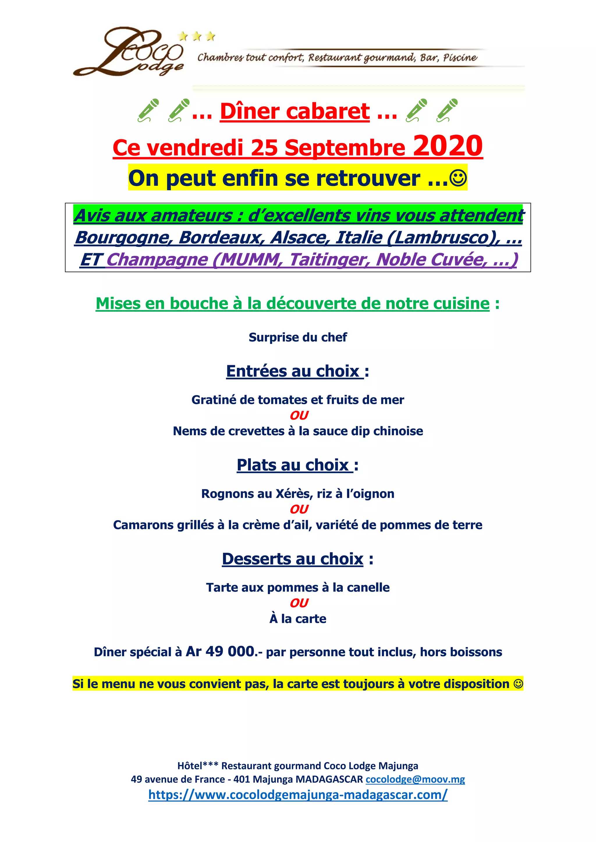 Le Coco Lodge à Majunga, Madagascar, propose un dîner cabaret le 25 septembre 2020 avec une sélection de vins d'exception et un menu comprenant des mises en bouche, des entrées, des plats principaux et des desserts. Les clients peuvent choisir entre différents plats comme rognons au xérès ou camarons grillés, et le repas est offert à 49 000 MGA par personne, hors boissons. Une carte alternative est également disponible si le menu ne convient pas.