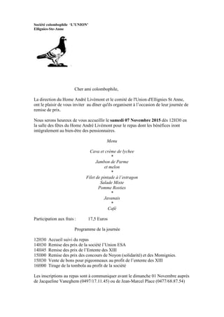 La société colombophile 'l'union' d'Ellignies-Ste-Anne invite les membres à un dîner de remise de prix le 07 novembre 2015 au home André Livémont, avec un menu dont les bénéfices soutiendront les pensionnaires. L'événement inclut des remises de prix et une tombola, avec une participation de 17,5 euros. Les inscriptions sont à confirmer avant le 01 novembre auprès des contacts fournis.