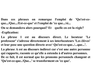 Ce document explique la différence entre le discours direct et le discours indirect en français, illustré par plusieurs exemples. Il souligne les changements dans la structure des phrases, tels que la transformation des questions et des pronoms, ainsi que les modifications des temps des verbes lors du passage du discours direct au discours indirect. Enfin, il propose des exercices pour pratiquer ces concepts.