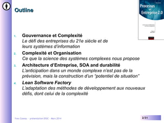 Le document aborde la conception de systèmes d'information dans un monde complexe, mettant en avant l'importance de l'agilité, de l'auto-organisation, et de l'adaptation à l'environnement pour les entreprises du 21e siècle. Il souligne que la complexité nécessite une approche collaborative et systémique, et présente l'architecture d'entreprise comme un moyen de maîtriser cette complexité. Enfin, il insiste sur la nécessité de développer des systèmes d'information durables et modulaires, capables de s'adapter aux besoins actuels tout en préservant la capacité d'évolution future.
