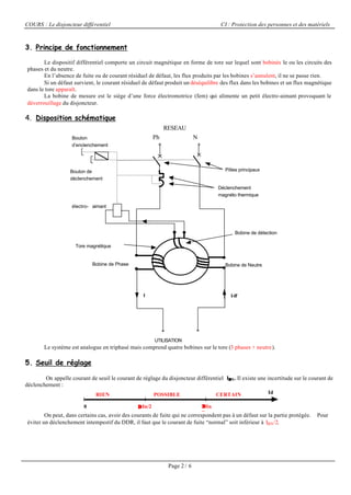 Ce document présente le fonctionnement, les types et les caractéristiques des disjoncteurs différentiels, qui assurent la protection des personnes et des matériels contre les surintensités et les contacts indirects. Il aborde également le principe de fonctionnement des dispositifs, le réglage des seuils et les temps de déclenchement associés. Enfin, il fournit des détails sur les types de relais et interrupteurs différentiels disponibles.