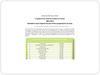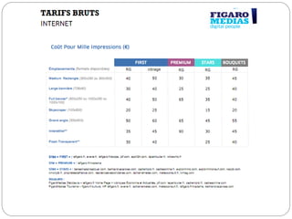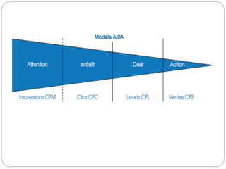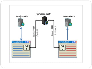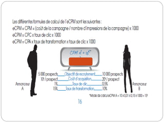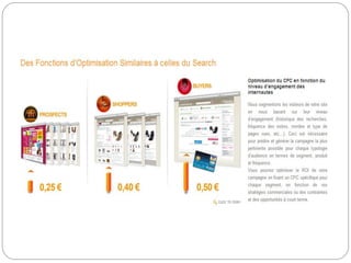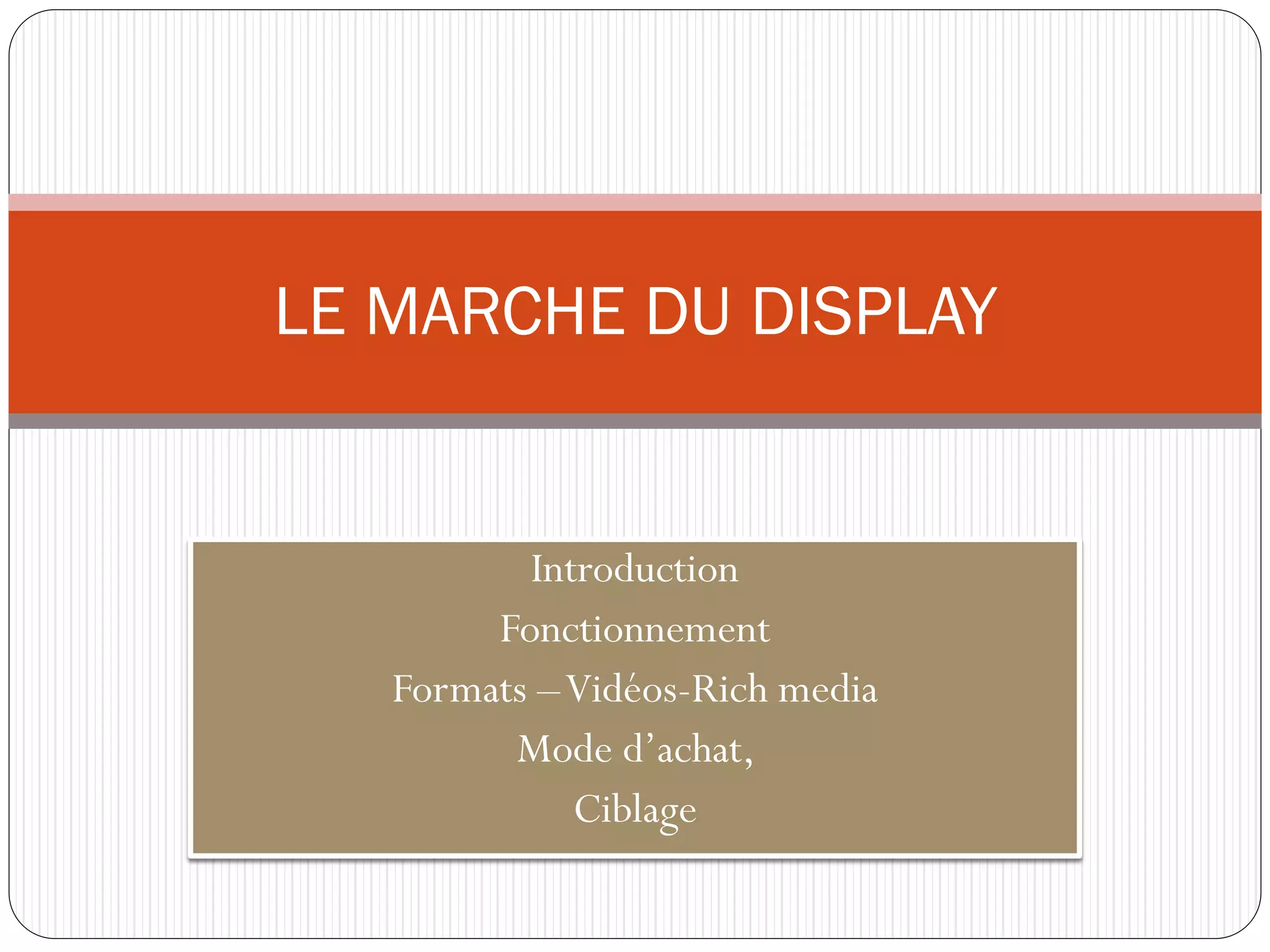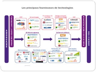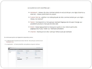 Le document présente un aperçu du marché de la publicité en ligne, notamment le fonctionnement des formats publicitaires, le rôle des annonceurs, éditeurs, et agences, ainsi que l'évolution vers les plateformes d'échanges publicitaires (ad exchanges) et le real-time bidding. Il souligne la complexité du marché, les défis d'efficacité et de ciblage, tout en discutant des principaux acteurs et des tendances actuelles dans la publicité display. Enfin, il aborde les différentes méthodes d'évaluation de la performance des campagnes publicitaires en ligne.