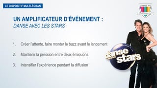 Le document décrit un dispositif multi-écran pour améliorer l'expérience télévisuelle, en créant de l'attente et en maintenant l'engagement des spectateurs à travers différentes phases d'émissions. Il met en avant les différentes communautés impliquées dans des programmes comme 'The Voice', soulignant l'interaction entre talents, coachs et consommateurs. La conclusion souligne la nécessité et l'importance de ce dispositif pour concevoir des programmes variés et engageants.