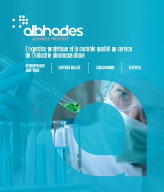 Le document présente les services d'expertise analytique et de contrôle qualité d'Albhades pour l'industrie pharmaceutique, soulignant leur système de qualité certifié et leur large gamme de techniques analytiques. Il met en avant une équipe dédiée offrant un suivi personnalisé pour le développement de méthodes, les études de stabilité et les audits. Albhades dispose de six plateaux techniques sur un même site, garantissant une réponse adaptée aux besoins spécifiques des clients.