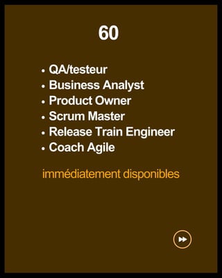 Le document présente 60 professionnels disponibles en Île-de-France, avec des compétences variées dans les domaines de l'agilité et de l'assurance qualité. Parmi eux, on trouve des testeurs, chefs de projet, analystes business, et certifiés dans des méthodologies reconnues, chacun ayant plusieurs années d'expérience. Il invite à les contacter pour plus d'informations.