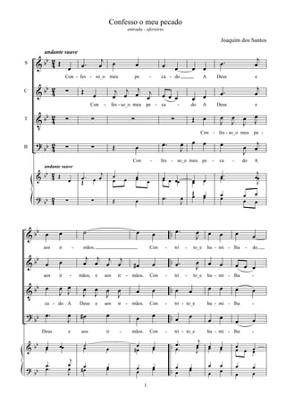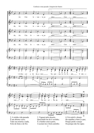 Le document présente une partition musicale avec des indications de chant et de rythme, centrée sur le thème de la confession des péchés à Dieu. Il évoque des émotions de contrition et de spiritualité, avec des références à la rédemption et à l'humilité. Le texte illustre une introspection sur la vie spirituelle et les luttes personnelles de l'âme.