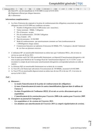 Le document présente un examen de comptabilité générale pour le lycée technique de Settat, couvrant la gestion des immobilisations et des amortissements pour l'entreprise Salim. Il inclut des consignes d'examen, des annexes avec des informations sur les factures et les acquisitions d'immobilisations, ainsi que des demandes spécifiques pour des calculs et des enregistrements comptables. Les étudiants doivent analyser et enregistrer les transactions comptables en rapport avec les acquisitions et les amortissements pour l'exercice 2011.
