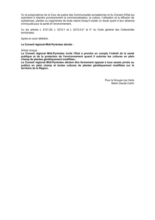 Le conseil régional de Midi-Pyrénées s'oppose aux cultures et essais en plein champ de plantes génétiquement modifiées (OGM) en raison des risques pour la santé humaine et l'environnement. Il évoque des précédents sanitaires pour justifier sa position et insiste sur la nécessité de préserver l'agriculture biologique et les productions labellisées. Le conseil invite l'État à considérer ces préoccupations dans ses décisions concernant les OGM.