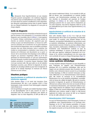 Le document traite de l'évaluation clinique de l'hyperferritinémie, soulignant l'importance de considérer l'âge et le sexe lors de l'interprétation des résultats. Il aborde les différentes causes possibles, notamment l'hémochromatose HFE et le syndrome métabolique, ainsi que les tests diagnostiques appropriés. Des recommandations pour le traitement, tels que les saignées, sont également présentées en fonction des résultats cliniques.