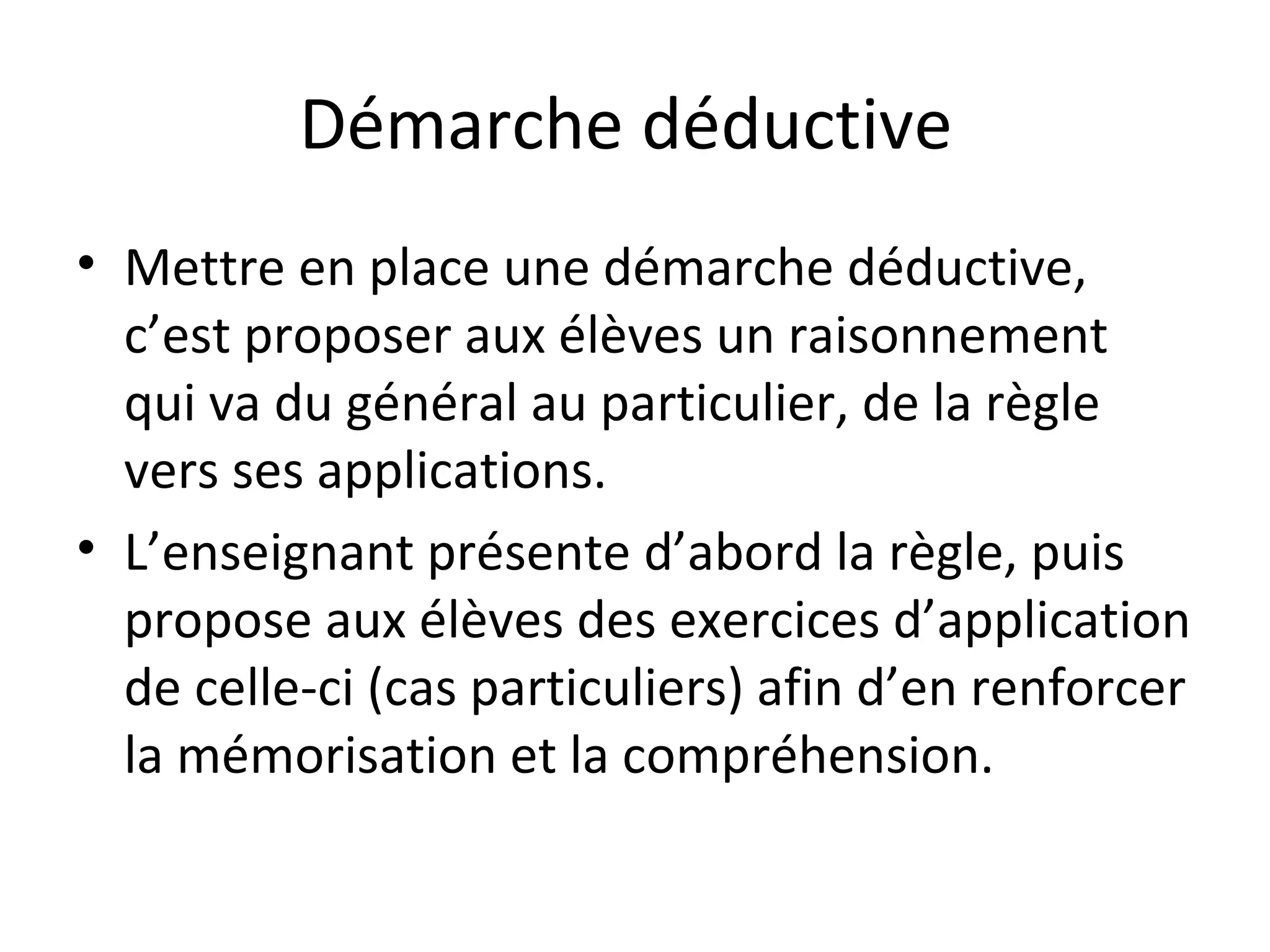Le document décrit différentes démarches pédagogiques utilisées en enseignement, notamment la démarche déductive qui va du général au particulier, la démarche inductive qui va du particulier au général, la démarche expérimentale d'investigation qui encourage le questionnement et l'émission d'hypothèses, et la démarche créative qui incite les élèves à agir et à créer. Chaque approche propose des méthodes spécifiques pour aider à la compréhension et à la mémorisation des concepts enseignés. L'enseignant joue un rôle clé dans la mise en place de ces démarches en guidant les exercices et les projets.