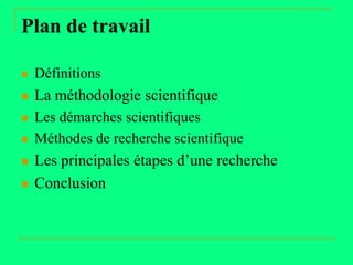 Le document présente un aperçu des démarches et méthodologies de la recherche scientifique, en distinguant entre recherche scientifique et commerciale, ainsi qu'entre raisonnements déductifs et inductifs. Il décrit les principales étapes et méthodes de recherche, depuis la définition d'une question jusqu'à la communication des résultats, tout en soulignant l'importance de l'observation critique et de l'objectivité. Enfin, il établit une relation entre théorie et pratique, montrant comment la recherche enrichit les connaissances et aide à résoudre des problèmes concrets.