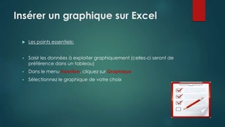 Ce document explique comment insérer un graphique dans Excel en saisissant d'abord les données dans un tableau. Il guide ensuite l'utilisateur à travers le menu insertion pour sélectionner le type de graphique souhaité. Une démonstration vidéo est également fournie pour aider à maîtriser ce processus.