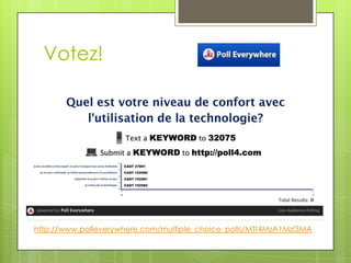 Le document présente l'intégration de la technologie dans l'enseignement des mathématiques, mettant l'accent sur l'apprentissage plutôt que sur les outils eux-mêmes. Il décrit l'évolution des ressources technologiques disponibles dans la salle de classe au fil des ans et propose des exemples d'utilisation de différentes technologies, comme les podcasts et les tableaux interactifs. L'objectif est d'apprendre des compétences du 21e siècle en utilisant la technologie de manière efficace et productive.