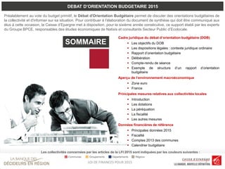 Le document présente la loi de finances pour 2015, en mettant l'accent sur le débat d'orientation budgétaire (DOB), qui est une étape essentielle pour les collectivités locales afin de discuter des orientations budgétaires avant l'adoption du budget primitif. Des mesures clés incluent une réduction des dotations et des efforts de péréquation pour soutenir les collectivités, tout en mettant en lumière le contexte macroéconomique du moment, marqué par une croissance modérée et des défis budgétaires. L'importance de la planification stratégique pour l'avenir des collectivités est également soulignée, notamment face à des contraintes financières croissantes.