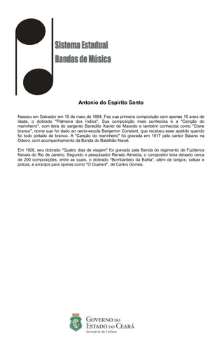 Antonio do Espírito Santo, né en 1884 à Salvador, est un compositeur brésilien connu pour ses œuvres musicales, notamment le célèbre 'Canção do Marinheiro' et plusieurs autres compositions militaires. Il a laissé un héritage de près de 200 pièces, incluant des tangos, valses, et arrangements pour des opéras. Son travail, incluant des instruments variés, continue d'être reconnu dans le cadre de la musique orchestrale brésilienne.