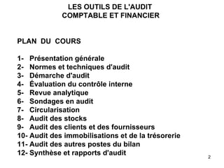 Le programme de formation de l'Association libanaise des comptables agréés de 2006 se concentre sur divers aspects de l'audit comptable et financier, y compris les normes, techniques, et étapes de l'audit. Il souligne l'importance de l'indépendance de l'auditeur et de la fiabilité des informations financières, en abordant la responsabilité des commissaires aux comptes ainsi que le rôle du contrôle interne. Le document explique également les démarches d'audit, les techniques d'examen analytique, et insiste sur la nécessité d'évaluation des risques pour garantir la qualité des audits.