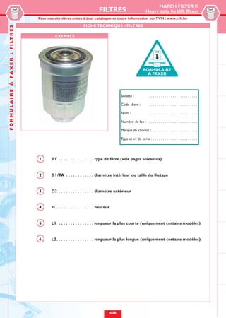 Le document présente une gamme de filtres lourds pour chariots élévateurs, avec des informations détaillées sur différents types de filtres, références et spécifications techniques. Il inclut également des catalogues, des formulaires de commande et des instructions pour l'utilisation de plusieurs modèles de filtres. TVH est mentionné comme source pour les mises à jour et les informations complémentaires.