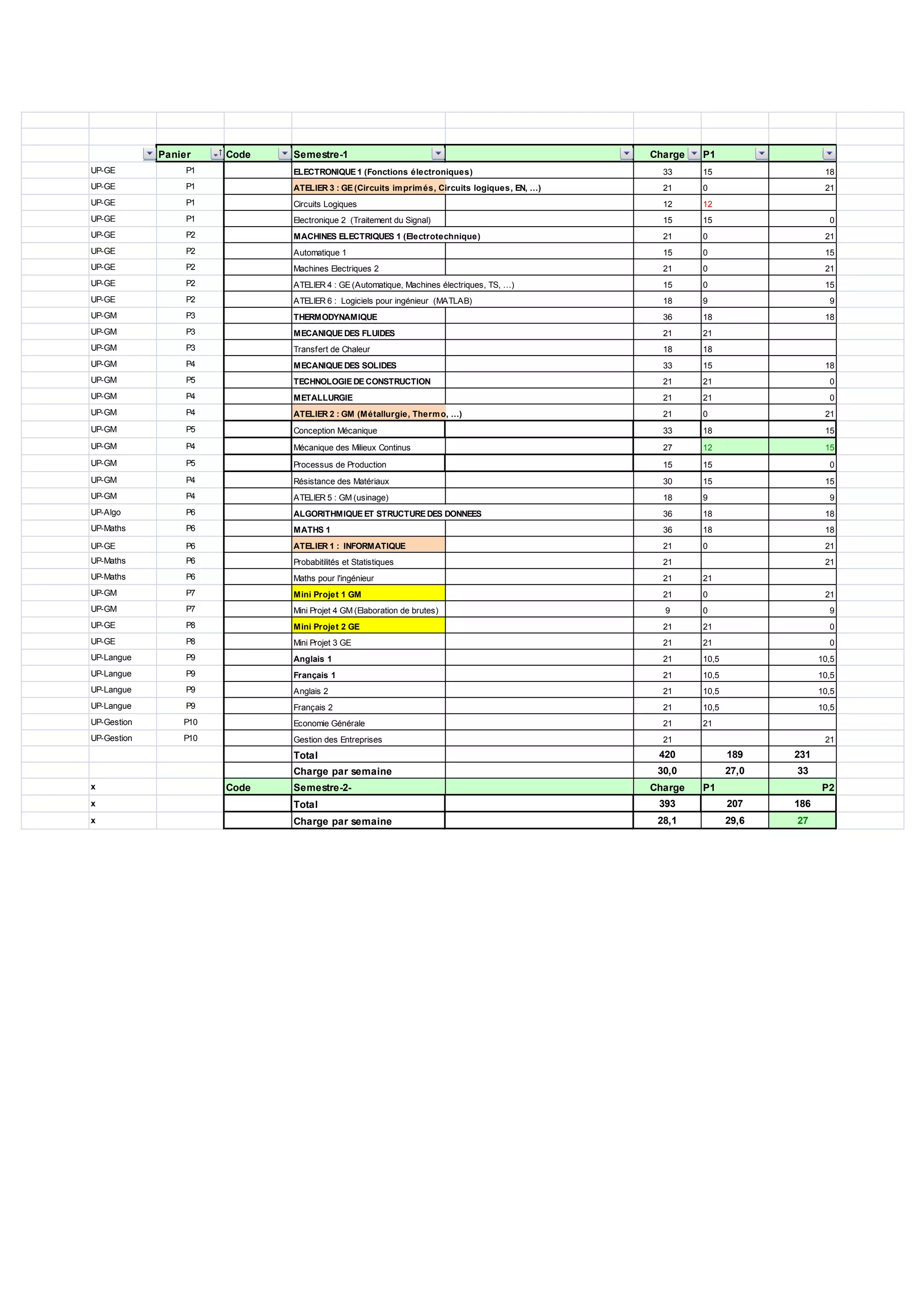 Le document présente une répartition des charges de cours pour différents semestres, incluant des matières telles que l'électronique, l'automatique, la thermodynamique et des ateliers pratiques. Les charges sont détaillées selon des catégories spécifiques et les crédits correspondants, ainsi que les heures de travail par semaine. Un total de 420 crédits est indiqué pour le semestre 1, avec une charge hebdomadaire moyenne de 30,0 heures.