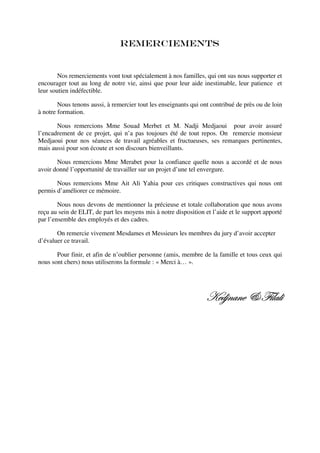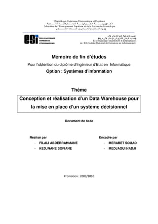Le document présente un mémoire de fin d'études sur la conception d'un data warehouse pour le groupe Sonelgaz, visant à améliorer son système décisionnel dans la distribution d'électricité et de gaz. Il aborde les enjeux et défis rencontrés dans la gestion des données client, ainsi que les solutions proposées pour faciliter l'analyse et le reporting. Ce projet a pour objectif d'implémenter une base de données dédiée répondant aux besoins d'analyse du groupe.
