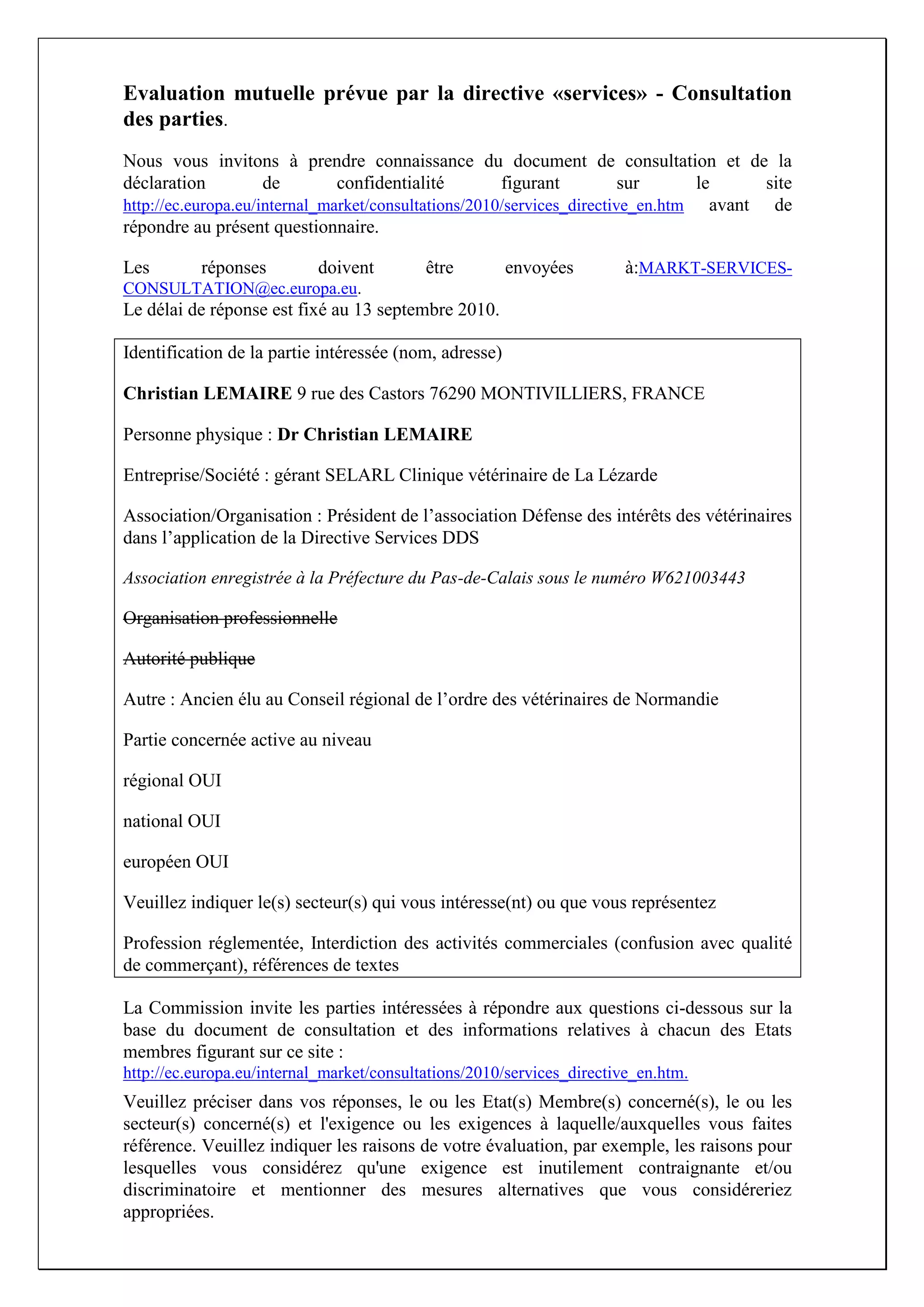La consultation invite les parties intéressées à évaluer la directive 'services', en se concentrant sur les exigences d'autorisation imposées aux prestataires de services et la compatibilité des directives 2005/36 et 2006/123 concernant les vétérinaires. Elle propose de réviser les régimes d'autorisation jugés disproportionnés et de faciliter l'exercice des activités vétérinaires en tenant compte des exigences européennes. Le document souligne également l'importance de la coopération administrative et des modifications nécessaires pour respecter ces directives.