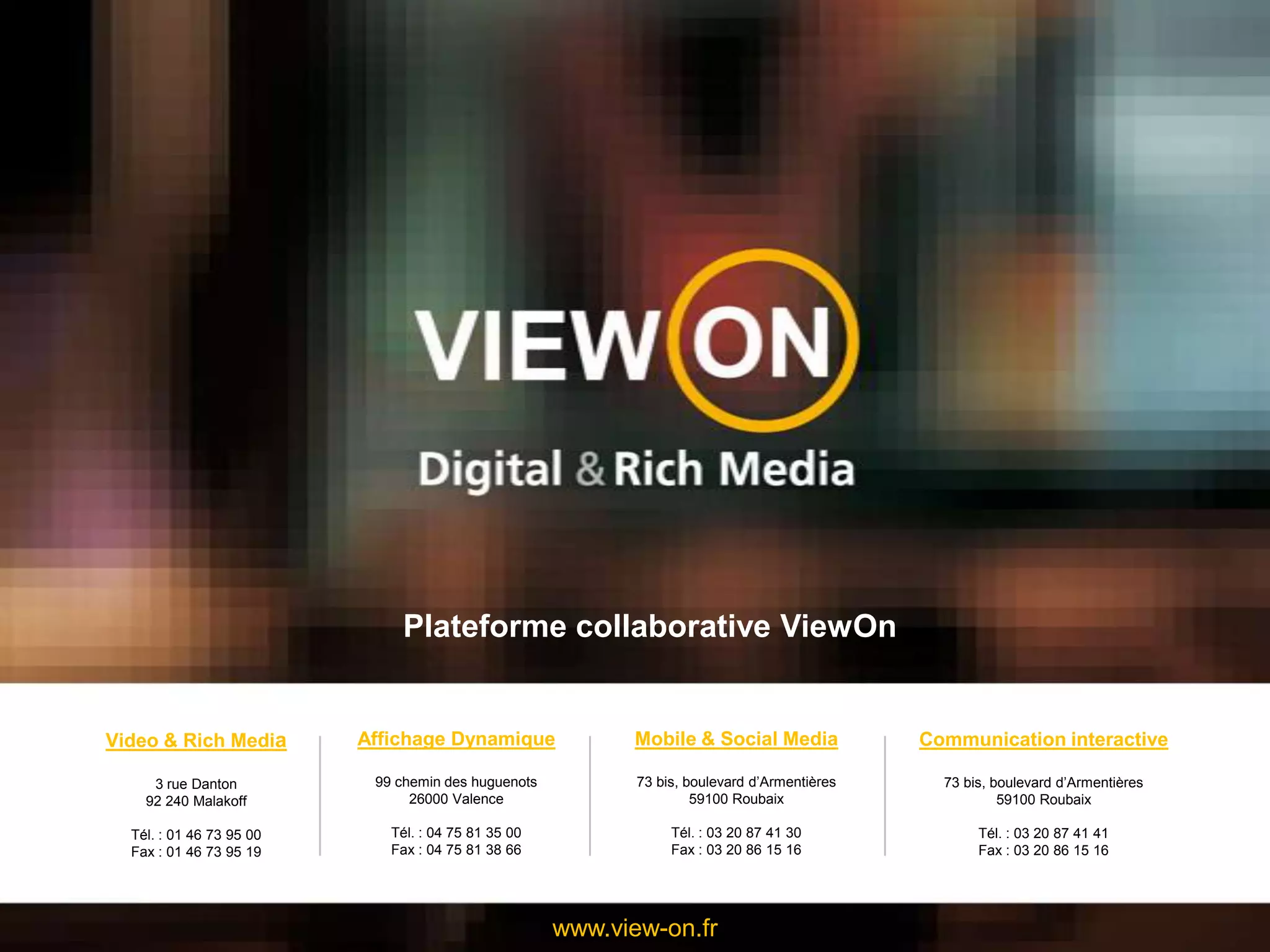 Viewon est une plateforme collaborative spécialisée dans la création et diffusion de rich media, affichage dynamique et applications mobiles, répondant aux besoins croissants des entreprises en communication digitale. Elle propose des solutions clé en main et une gestion intuitive de contenu, permettant l'interaction, le partage et la création de documents en ligne entre membres. La société met en avant son expertise à travers plusieurs cas d'utilisation pour des secteurs variés, tout en s'engageant à offrir un accompagnement personnalisé.