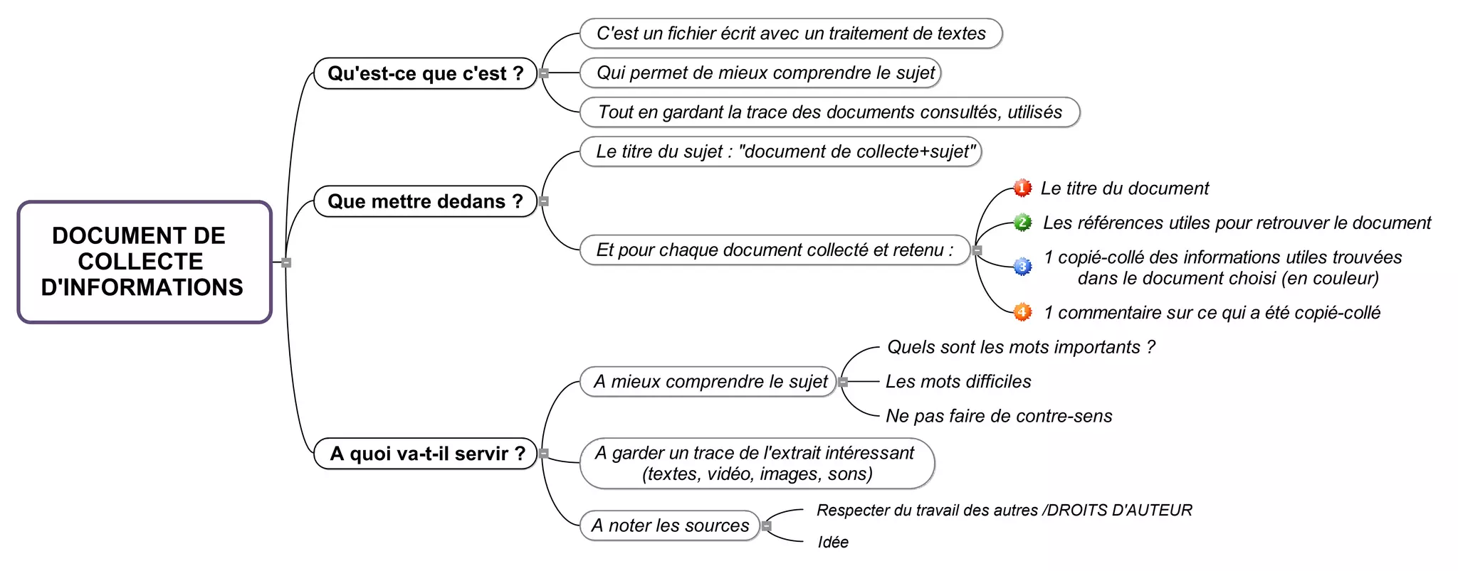 Ce document explique comment créer un fichier de collecte d'informations sur un sujet en utilisant un traitement de texte. Il souligne l'importance de garder une trace des documents consultés, d'extraire des passages utiles et de respecter les droits d'auteur. Enfin, il mentionne la nécessité de commenter les extraits et d'identifier les mots importants.