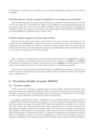Le projet Relios consiste en la conception et la réalisation d'un capteur solaire en matériaux de récupération pour chauffer l'eau, dans le but de réduire les coûts et l'impact environnemental des installations solaires. Ce prototype, conçu pour être facilement autoconstruit, vise à fournir une proportion significative des besoins en eau chaude d'une famille tout en sensibilisant les utilisateurs à la revalorisation des déchets. Les résultats montrent que le capteur Relios offre des performances compétitives par rapport aux systèmes commerciaux tout en rendant l'énergie solaire accessible à un plus grand nombre.