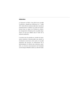 Le guide d'investissement dans la région de l'Oriental du Maroc met en avant les opportunités d'investissement dues à la richesse des ressources naturelles, la position géographique favorable et l'engagement des autorités locales pour le développement économique. Les avancées institutionnelles post-2011, ainsi que le soutien gouvernemental et les développements d'infrastructures, positionnent cette région comme un lieu attractif pour les investisseurs, notamment dans les secteurs de l'agriculture, du tourisme et des énergies renouvelables. Ce document, élaboré conjointement par la CNUCED et la CCI, vise à renforcer le dialogue entre investisseurs et gouvernements pour favoriser des investissements durables et profitables.