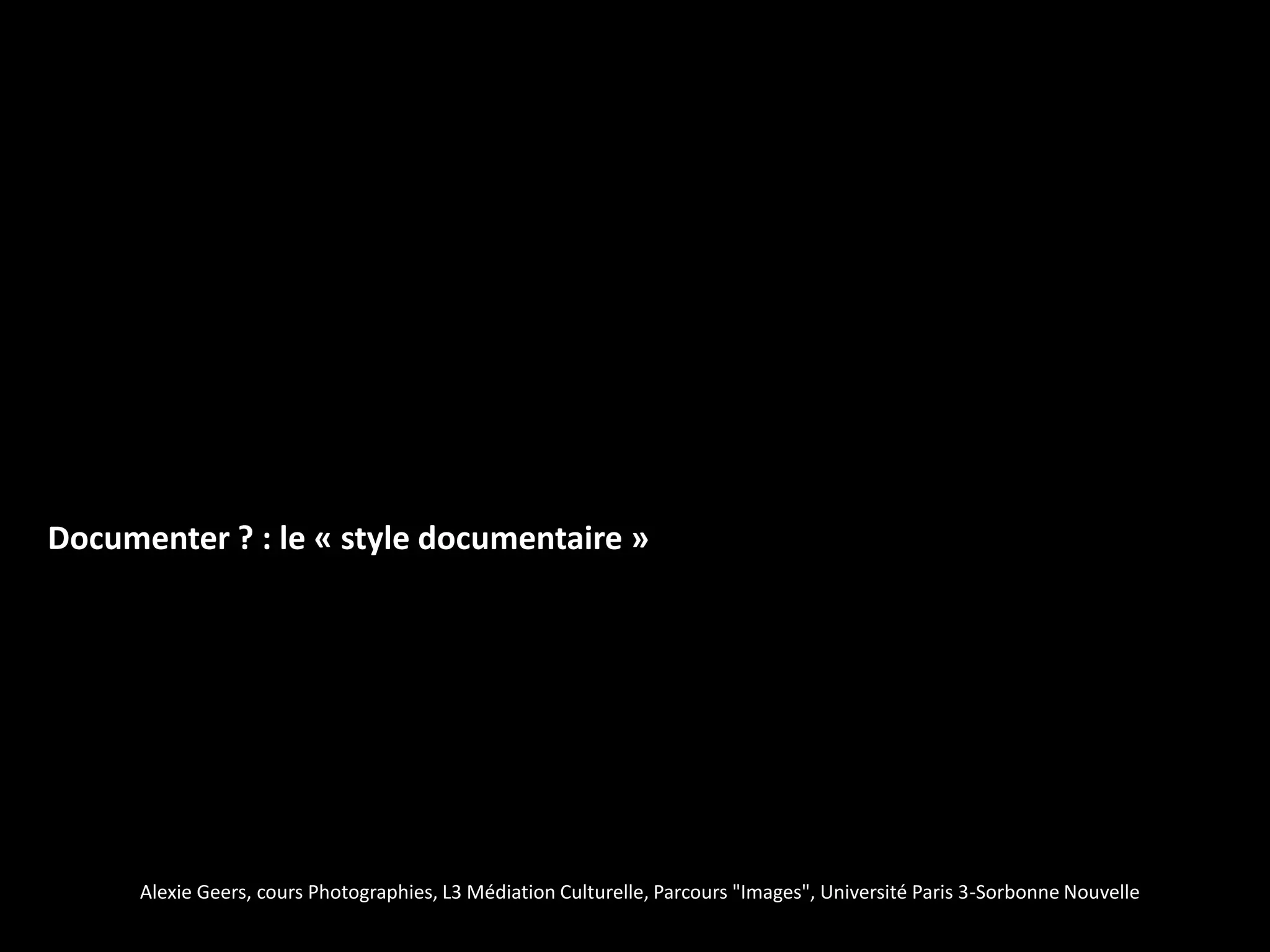 Ce document présente un cours sur le style documentaire en photographie, mettant en avant des œuvres de photographes célèbres comme August Sander, Walker Evans, Henri Cartier-Bresson, et Robert Doisneau. Il décrit différentes périodes et sujets abordés par ces artistes, illustrant leur impact sur la représentation visuelle de la culture et de la société. Le contenu reflète une analyse de l'évolution et des techniques du style documentaire au travers de plusieurs œuvres emblématiques.