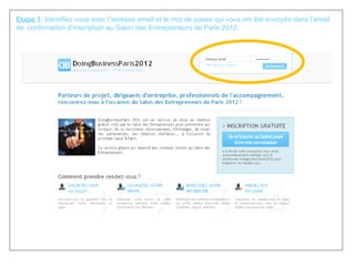 Le document décrit les huit étapes à suivre pour participer au salon des entrepreneurs de Paris 2012, allant de l'inscription à la prise de rendez-vous avec d'autres visiteurs. Chaque étape comprend des instructions sur la manière de compléter son profil, de rechercher des profils d'intérêt et de valider des rendez-vous. Les participants doivent également se rendre au palais des congrès pour leurs rendez-vous à l'heure convenue.