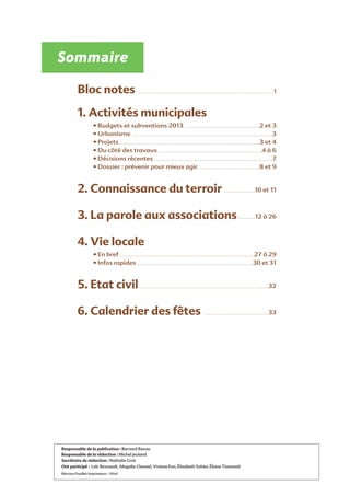 Le document présente un bloc-notes municipal d'activité pour Domagné, abordant les budgets de 2013, les projets d'urbanisme, ainsi que divers événements locaux et décisions concernant l'éducation. Malgré les défis économiques, la commune maintient une situation financière saine et n'augmente pas les impôts locaux. Des projets de développement, tels que la construction d'une maison de santé et l'extension de zones d'activités, sont en cours pour soutenir l'emploi et l'attractivité de la commune.